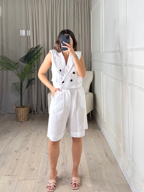 Set composto da gilet corto e bermuda con zip e bottone frontale ed elastico sul retro